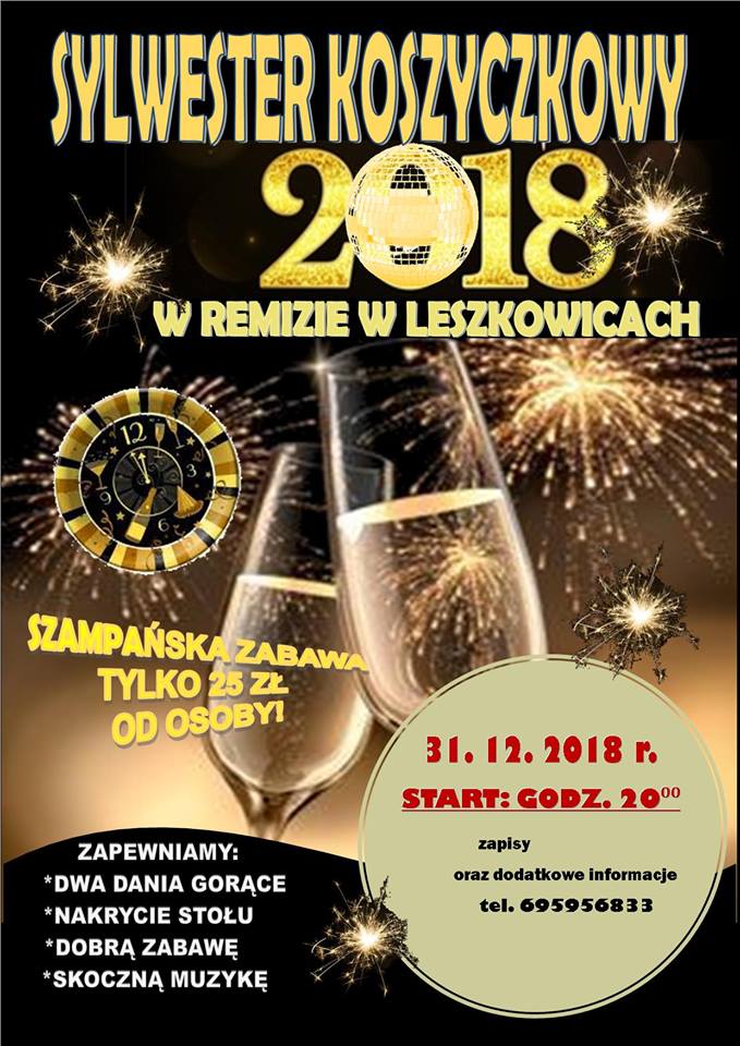 W imieniu OSP Leszkowice Zapraszamy serdecznie na Sylwester Koszyczkowy 2018 w Leszkowicach!